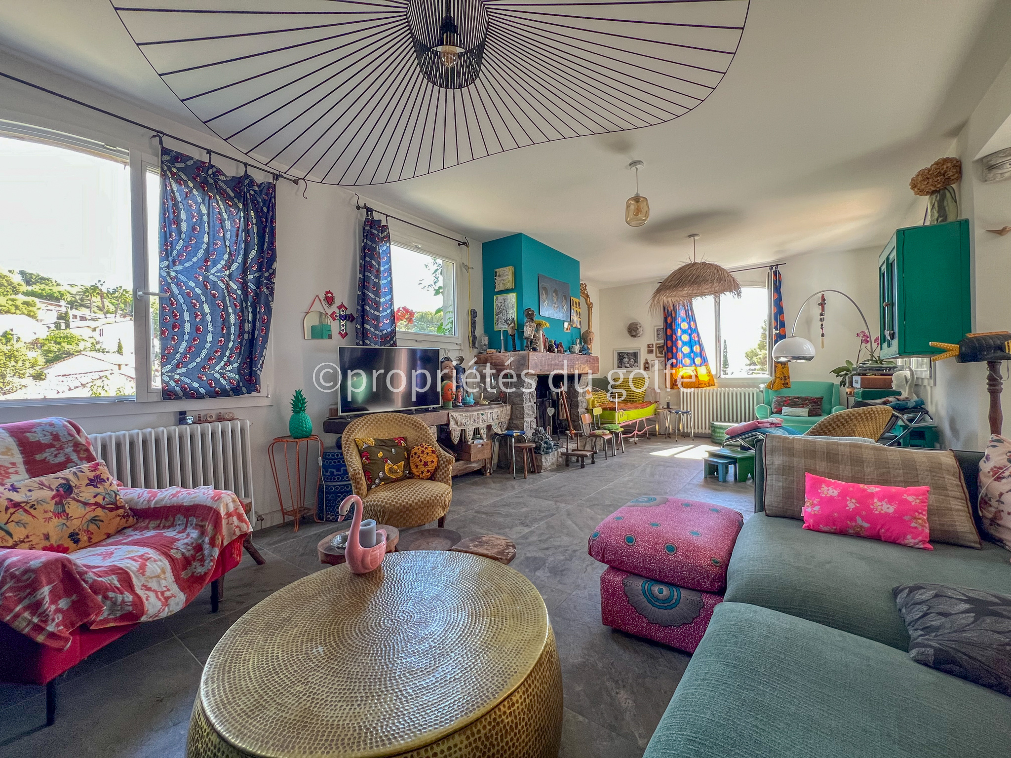 Situé dans un environnement privilégié, cette villa de charme de 1979, entièrement repensée et réactualisée, séduit par son caractère unique et son âme d'artiste. D'une superficie de 200m² environ habitables, elle s'élève sur un magnifique terrain paysager de 1237m², véritable écrin de verdure. A l'étage, une vue mer vient sublimer les espaces de vie, tandis que le jardin révèle de multiples ambiances : piscine ensoleillée, cuisine d'été conviviale, majestueux cèdre du Liban et de charmants coins ombragés invitant à la détente ou aux repas d'été.Cette demeure familiale offre une atmostphère chaleureuse et singulière, idéale pour les amateur de bien-être. Le logement comprend a l'étage, une véranda d'entrée aménagée comme un jardin d'hiver, un espace cocooning avec poêle à bois, un vaste volume de vie avec séjour/salon avec cheminée, une cuisine semi-fermée avec verrière, le tout s'ouvrant sur une confortable terrasse avec vue mer, une chambre, salle d'eau. Au rez-de- jardin, un salon, quatre chambres, salle d'eau, une agréable terrasse couverte prolongée par le jardin. Le plus, possibilité d'aménager les combles (escalier déjà existant) avec terrasse bénéficiant d'une belle vue mer. (Déclaration préalable acceptée). Proche des plages et des commodités. REF.1324