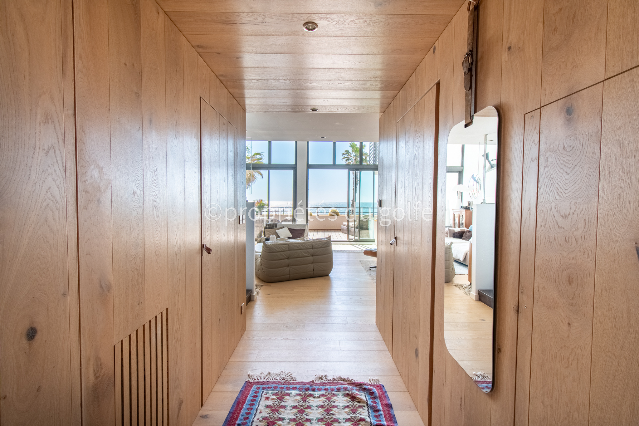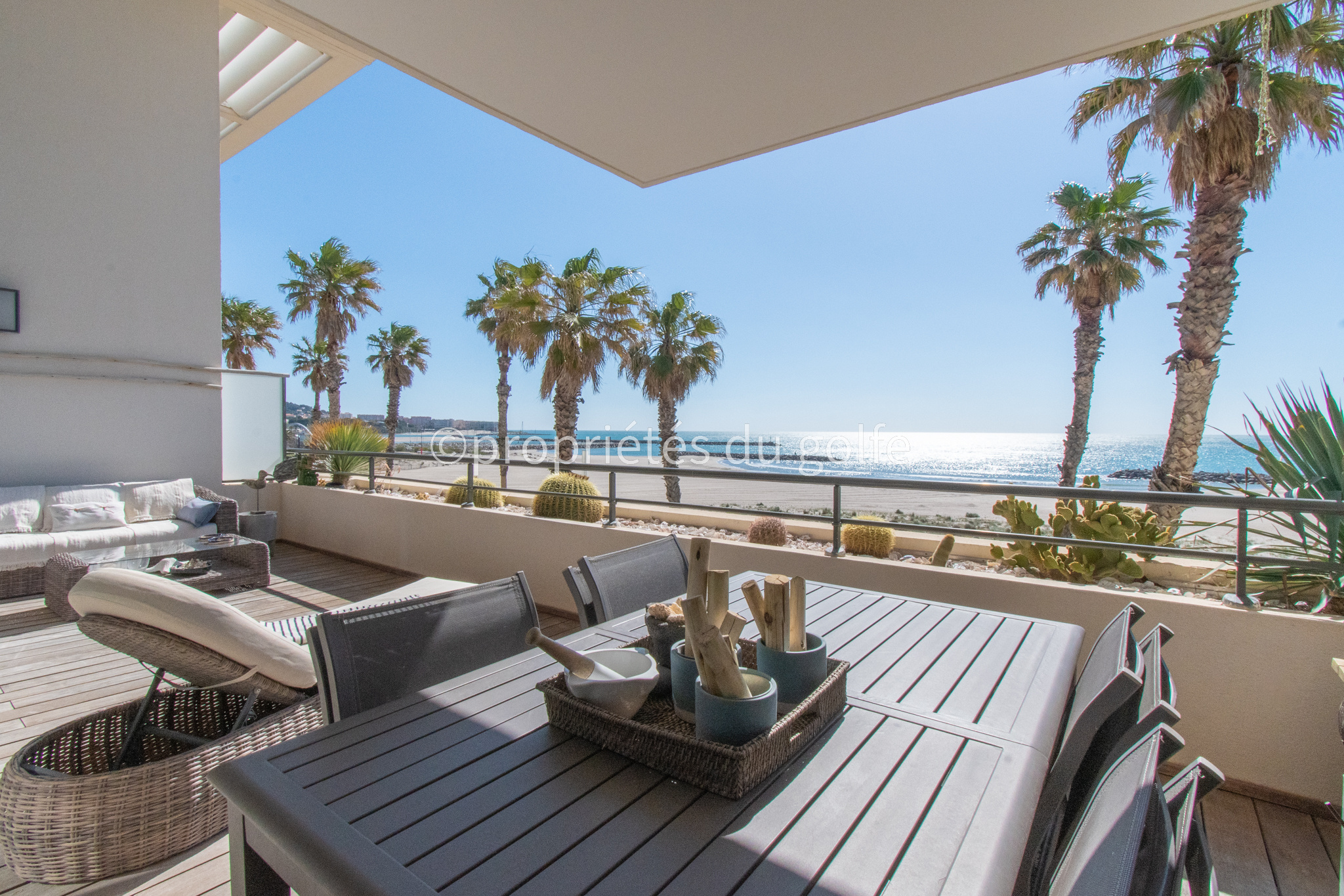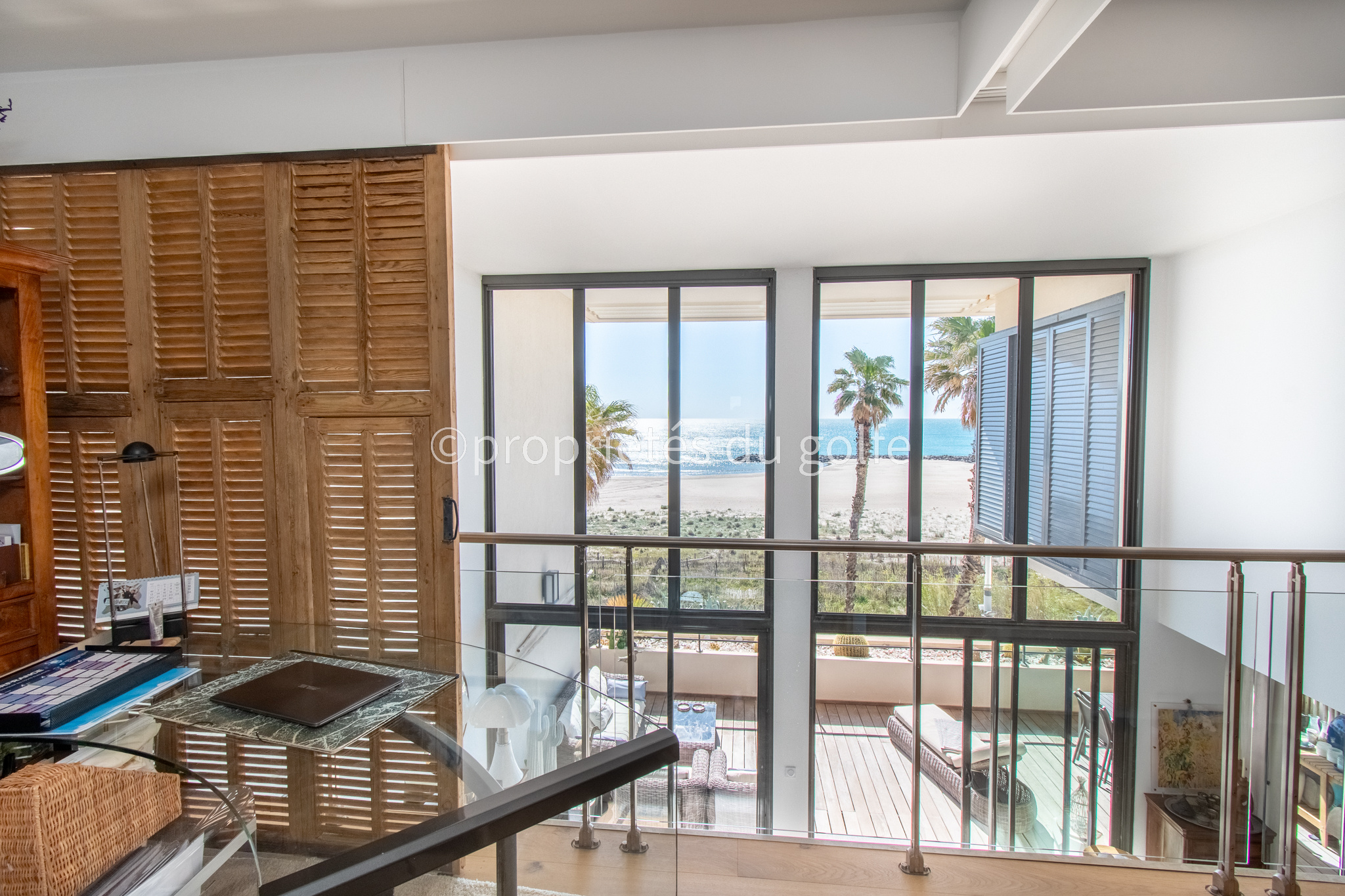Dans l'un des emplacements les plus recherchés et privilégiés de Sète et de toute la région, en front de mer, au pied de la plage et de la voie verte, découvrez ce duplex d'exception situé au dernier étage d'un immeuble de haut standing, en petite copropriété parfaitement entretenue, dans le prisé quartier de Villeroy. Entièrement repensé et rénové avec des prestations de grande qualité, cet appartement de 111.85m² habitable environ, offre une ambiance chaleureuse, raffinée et résolument contemporaine, sublimée par des volumes spectaculaires et une vue mer à couper le souffle. Dès l'entrée, le ton est donné : un volume incroyable, baigné de lumière, s'ouvre devant vous. Le séjour se déploie sous une baie vitrée monumentale offrant un panorama exceptionnel et permanent sur la mer et les plages. Cet espace de vie réunit harmonieusement un salon élégant, un séjour convivial et une cuisine parfaitement équipée, cellier, le tout prolongé par une agréable terrasse de 35m². Une buanderie complète ce niveau avec fontionnalité et discrétion. A l'étage, la suite parentale est un véritable cocon face à la Méditerranée. Elle peut s'ouvrir ou se fermer sur la vue mer selon vos envies et dispose d'une salle de bain/douche ainsi que d'un espace dressing et un coin bureau. Une seconde chambre, astucieusement aménagée, offre un bel espace comprenant une chambre adulte et un espace couchage complémentaire de trois places superposées, accompagnée de sa salle d'eau. Pour parfaire ce bien, vous bénéficierez de deux places de parking couvertes sécurisées ainsi que d'un cellier. A proximité immédiate des commerces, des transports et bien sûr au pied de la plage, ce duplex unique conjuge emplacement d'exception, prestations haut de gamme et art de vivre au bord de la mer. REF 1398