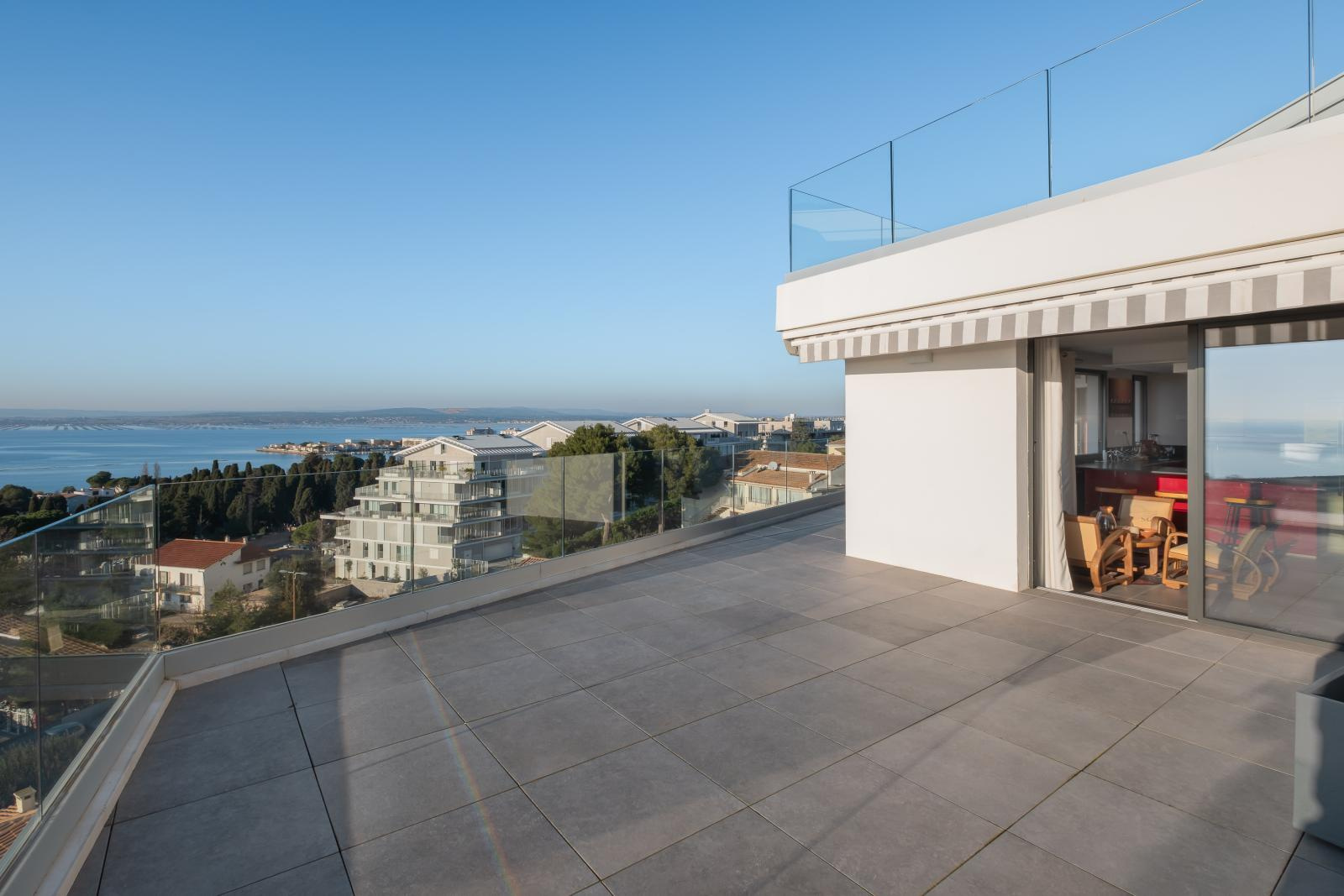 Proches des plages et du quartier de la corniche à Sète, dans une belle résidence moderne, appartement 4 pièces de 90m2 hab environ prolongé de sa terrasse de 97m2, surplombant la lagune de Thau et la mer. Au 5e étage de l'immmeuble, il se compose d'un salon séjour avec cuisine ouverte équipée, 3 chambres, une salle d'eau. Pour le stationnement, un grand garage double en sous sol. Réf 1381