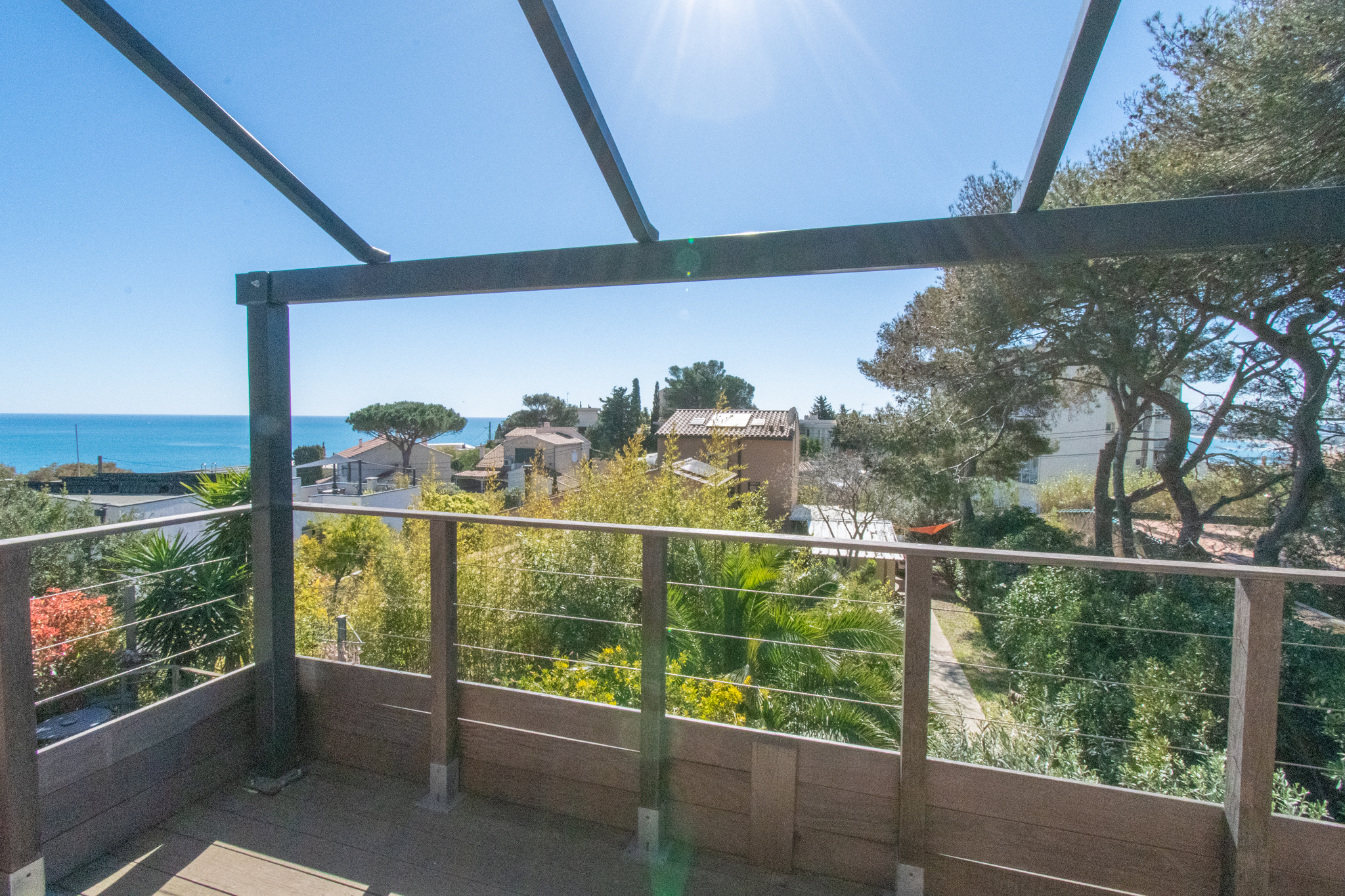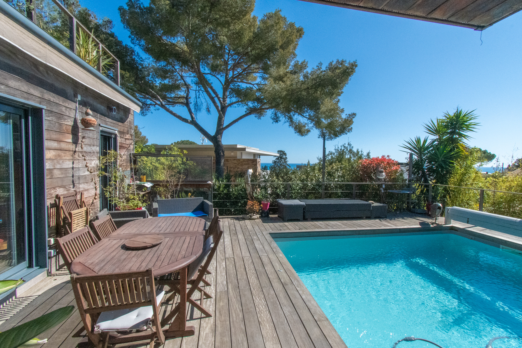 Située dans l'un des secteurs les plus recherchés de Sète, à proximité des plages et des commerces de la Corniche, cette propriété est proposée en vente en nue-propriété, le vendeur conservant l'usufruit et l'usage du bien sa vie durant. Implantée sur le bas du mont Saint Clair, versant sud, la maison bénéficie d'un environnement naturel privilégié, à l'abri des vents dominants. Nichée au coeur d'un écrin de verdure, elle semble se frondre harmonieusement dans la végétation, offrant un cadre de vie intime. Edifiée sur un terrain paysager de 597m², cette villa d'une superficie habitable d'environ 100m² profite d'une vue mer. Son architecture en bois renfoce son intégration parfaite dans son environnement naturel. L'entrée s'ouvre sur une vaste pièce de vie avec cuisine ouverte, parfaitement équipée, largement ouverte sur l'extérieur, grace à de généreuses baies vitrées. La terrasse en bois prolonge cet espace vers une agréable piscine chauffée. Une chambre de plain-pied avec salle d'eau privative complète ce niveau. A l'étage, deux chambres dont une avec un point d'eau, la seconde bénéficie d'une salle d'eau, un dressing. Toutes deux sont agrémentées d'une terrasse avec vue mer. En complément, place de parking et une confortable annexe pouvant accueillir vos amis en toute dépendance. REF 1386